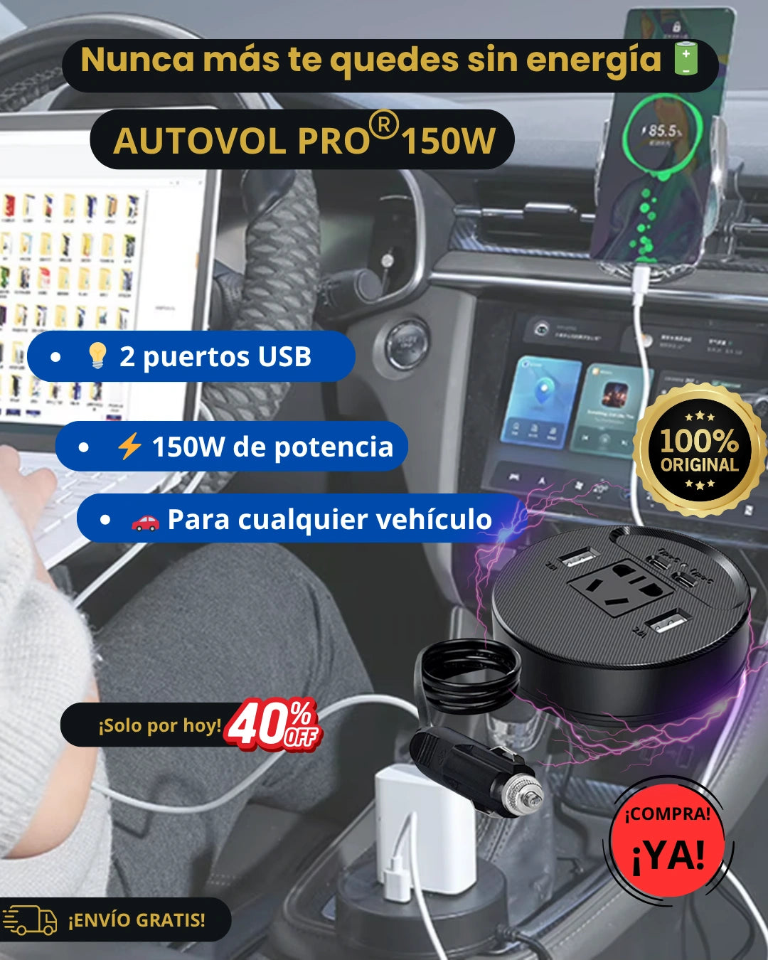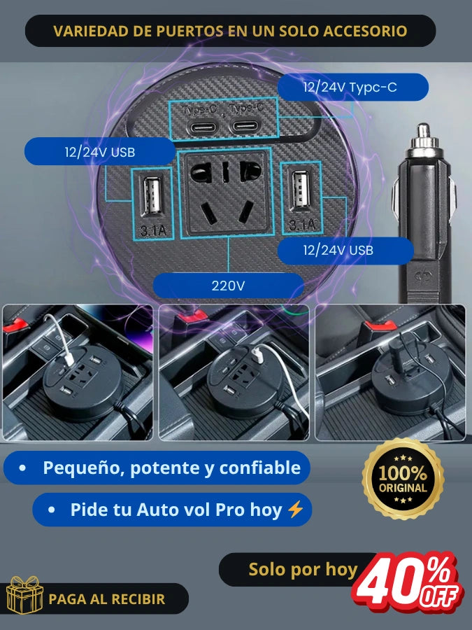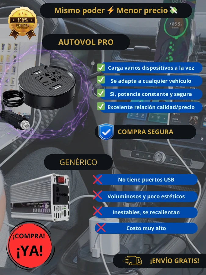 Sí. El Autovol Pro 150W funciona con cualquier vehículo que tenga puerto de encendedor de 12V: autos, camionetas, SUVs o incluso motos con adaptador.
