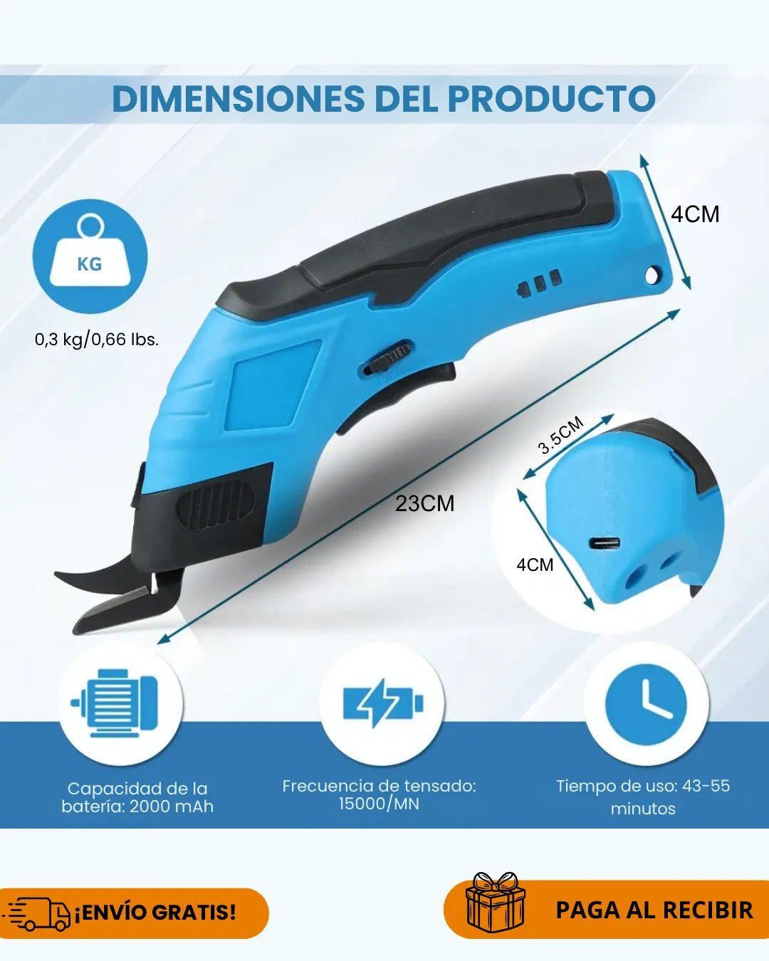 Las tijeras tienen una batería recargable de 2000 mAh 🔋 que ofrece hasta 2 horas de uso continuo. Se cargan por USB en aproximadamente 2 a 3 horas, igual que un celular.